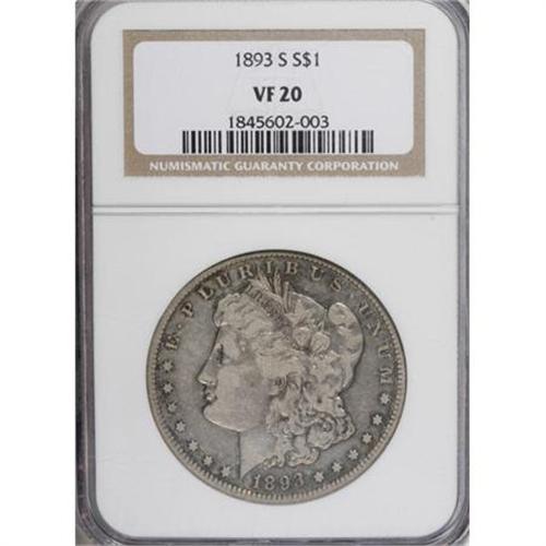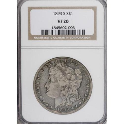 <B>1893-S $1 VF20 NGC.</B></I> Unquestionably authentic and undoubtedly original, this example is about as attractive as possible, for the grade. It is evenly worn and displays appealing aquamarine and gold patina near the obverse and reverse peripheries. Severe abrasions are not found on either side of the piece. One of the chief key dates in the Morgan dollar series, along with its predecessor (the '92-S); an example of the '93-S is a welcome addition to any numismatic auction. <BR><BR><b>Shipping:</b> Coins & Currency (<a target="_blank" href="http://www.heritageauctions.com/common/shipping.php">view shipping information</a>)