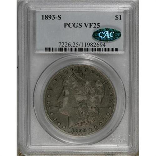 <B>1893-S $1 VF25 PCGS. CAC.</B></I> The obverse of this '93-S dollar features an attractive blend of rose-gray patination, while the reverse assumes light silver-gray color. The design elements display nice definition, even after taking into consideration the moderate wear accounting for the grade designation. Both sides are quite clean for a moderately circulated coin.<BR><BR><B>Coin Engraver:</B> George T. Morgan<BR><BR><b>Shipping:</b> Coins & Currency (<a target="_blank" href="http://www.heritageauctions.com/common/shipping.php">view shipping information</a>)