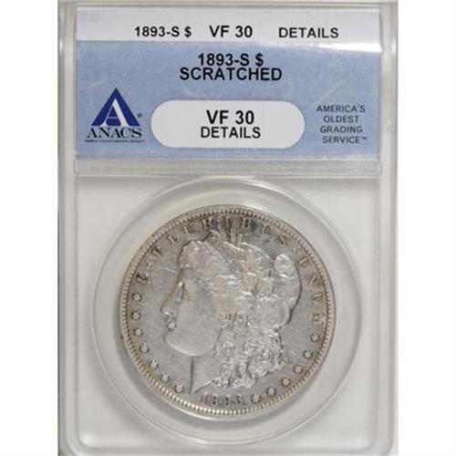 <B>1893-S $1 --Scratched--ANACS. VF30 Details.</B></I> Light silver-gray surfaces with a few hairlines and some minor obverse scratches. Hints of pale gold color remain near the borders. Despite some minor imperfections, this attractive example will prove to be a nice addition to a circulated Morgan dollar collector.<BR><BR><B>Coin Engraver:</B> George T. Morgan<BR><BR><b>Shipping:</b> Coins & Currency (<a target="_blank" href="http://www.heritageauctions.com/common/shipping.php">view shipping information</a>)