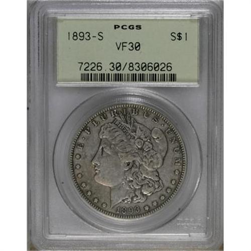 <B>1893-S $1 VF30 PCGS.</B></I> Light gray surfaces provide an entirely natural appearance to this attractive key-date 1893-S Morgan dollar. Darker steel patina adheres to both sides, outlining all of the devices, including the central motifs as well as the peripheral lettering. Diagnostics of the issue are clearly visible.<BR><BR><B>Coin Engraver:</B> George T. Morgan<BR><BR><b>Shipping:</b> Coins & Currency (<a target="_blank" href="http://www.heritageauctions.com/common/shipping.php">view shipping information</a>)