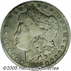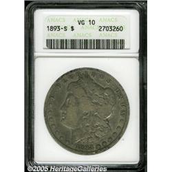 <B>1893-S<img border='0' src='http://www.heritagecoins.com/images/star.gif' width=10 height=10>$1 VG10 ANACS.</B></I> There are a few small edge chips on the obverse rim. Despite 50 points of wear, the wings have pleasing detail. The rarest business strike issue.