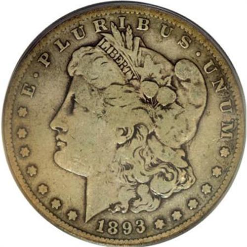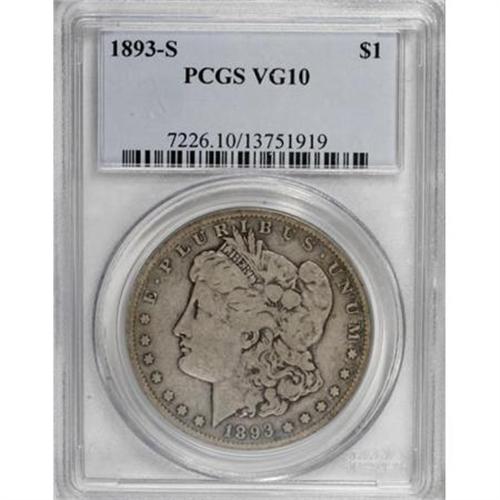 <B>1893-S $1 VG10 PCGS.</B></I> All of the major design elements are intact, and the mintmark is easily discernible on this well circulated Morgan dollar. The evenly worn surfaces display dove-gray toning and few noticeable marks. The 1893-S had a tiny mintage of 100,000 pieces, ensuring its status as the most famous key date in the Morgan dollar series. <BR><BR><B>Coin Engraver:</B> George T. Morgan<BR><BR><b>Shipping:</b> Coins & Currency (<a target="_blank" href="http://www.heritageauctions.com/common/shipping.php">view shipping information</a>)