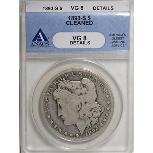 <B>1893-S $1 --Cleaned--ANACS. VG8 Details.</B></I> Light silver-gray surfaces reveal fine hairlines under magnification. Still a rather nice key date representative that will fit comfortably in a low to mid-grade Morgan dollar set. The few minute marks scattered about are consistent with the grade designation.<BR><BR><B>Coin Engraver:</B> George T. Morgan<BR><BR><b>Shipping:</b> Coins & Currency (<a target="_blank" href="http://www.heritageauctions.com/common/shipping.php">view shipping information</a>)