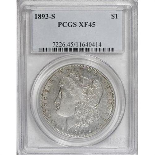 <B>1893-S $1 XF45 PCGS.</B></I> Writing about the 1893-S dollar in his <I>Guide Book of Morgan Silver Dollars</B></I> (2005), David Bowers says: " The majority of known pieces, into the thousands, are in the single grade category of Very Fine. Most such pieces circulated in the American West, and for an appropriate but apparently restricted time, to bring them to this grade."<BR> We offer the opportunity here for the Morgan dollar specialist, or even for non-specialists who want to acquire key-date coins, to obtain a pleasing Choice XF example. Traces of luster reside in the protected areas of the silver-gray surfaces that exhibit occasional wisps of gold-tan color, and the design features are nicely detailed. A few minuscule marks on the cheek are not out of context for a large, heavy silver coin that saw limited circulation. This piece will fit comfortably in a high-grade Morgan dollar date/mintmark set.<BR><BR><b>Shipping:</b> Coins & Currency (<a target="_blank" href="http://www.heritageauctions.com/common/shipping.php">view shipping information</a>)