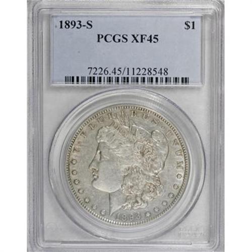 <B>1893-S $1 XF45 PCGS.</B></I> This Choice XF piece would be near the top of any Morgan collector's want list, likely more so than the proof-only 1895 Morgan dollar that is normally collected alongside the business strikes, since the circulation issues have turned out to be nonexistent. Only at the largest coin shows can one find a decent selection of certified 1893-S dollars to choose from, as the smaller shows are typically apt to feature perhaps only a lone VG or two. (And certification is essential for the 1893-S Morgan, as some of those same shows will reveal in the form of some spurious examples.)<BR> The present piece, of course, shows the tiny die chips in the bottom left foot of the R in LIBERTY and the diagonal die line through the top of the T that are seen on all genuine examples. Perhaps one-third of the original mint luster remains, and the silvery surfaces show a glint of gold on the highpoints while remaining largely untoned. There are no distracting contact marks, save for a single tick at the bottom of the eagle's breast. A nice collector's coin that will not look out of place in a Mint State set.<BR><BR><B>Coin Engraver:</B> George T. Morgan<BR><BR><b>Shipping:</b> Coins & Currency (<a target="_blank" href="http://www.heritageauctions.com/common/shipping.php">view shipping information</a>)