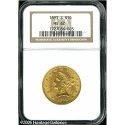 <B>1893-S $10 MS62 NGC.</B></I> A high-end orange-gold specimen with devices that are intricately detailed and surfaces that gleam with luster. Seemingly an underrate issue as very few examples exist above MS62. Population: 79 in 62, 5 finer (1/05). Lot:8803