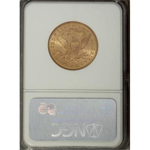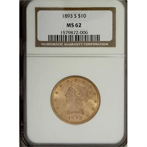 <B>1893-S $10 MS62 NGC.</B></I> Strong, swirling luster enlivens the vivid orange-gold surfaces of this S-mint eagle. The boldly struck devices and nearby fields show a number of light to moderate marks. NGC has certified 15 finer examples (1/08).<BR><BR><B>Coin Engraver:</B> Christian Gobrecht<BR><BR><b>Shipping:</b> Coins & Currency (<a target="_blank" href="http://www.heritageauctions.com/common/shipping.php">view shipping information</a>)