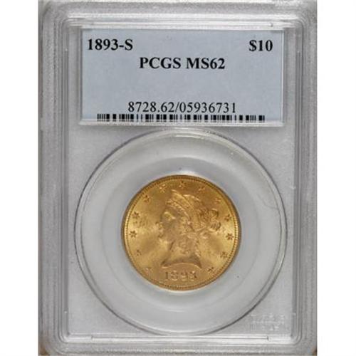 <B>1893-S $10 MS62 PCGS.</B></I> Complete cartwheel luster exudes from peach-gold surfaces that display sharply struck design elements. The portrait and reverse field are typically abraded. Jeff Garret and Ron Guth (2006) write: "Although the 1893-S eagle is considerably rarer than the 1893-S silver dollar, a smaller audience for the former means that it sells for a fraction of the price of the latter."<BR><BR><B>Coin Engraver:</B> Christian Gobrecht<BR><BR><b>Shipping:</b> Coins & Currency (<a target="_blank" href="http://www.heritageauctions.com/common/shipping.php">view shipping information</a>)