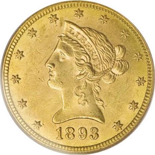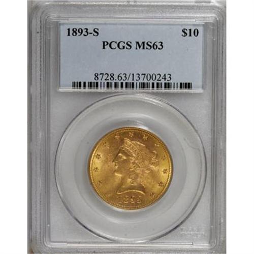 <B>1893-S $10 MS63 PCGS.</B></I> A sharply struck and fully lustrous example. No marks are worthy of discussion, and the overall look is less abraded than is usual for the grade. The 1893-S is a scarce low mintage issue. Select examples are both rare and desirable. Population: 29 in 63, 4 finer (8/07).<BR><BR><B>Coin Engraver:</B> Christian Gobrecht<BR><BR><b>Shipping:</b> Coins & Currency (<a target="_blank" href="http://www.heritageauctions.com/common/shipping.php">view shipping information</a>)
