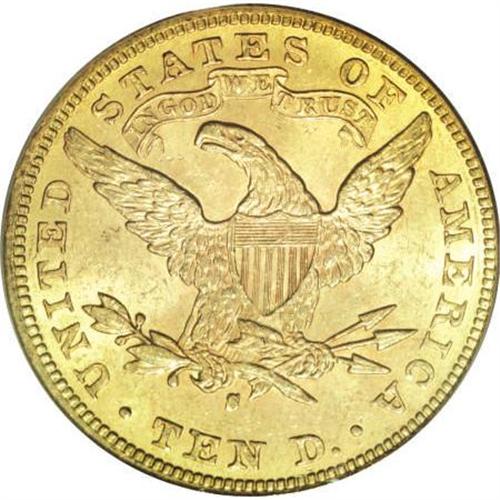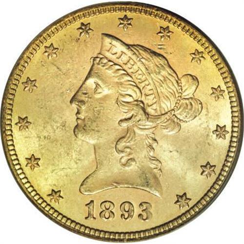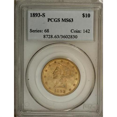<B>1893-S $10 MS63 PCGS.</B></I> The 1893-S is a lower mintage issue. Examples are available in AU58 to MS62 grades, but because of improper bag storage and shipment, the issue becomes rare at the MS63 level. This well struck and satiny representative has alternating olive and apricot toning. Faint marks are scattered but are never distracting. Population: 31 in 63, 4 finer (12/07).<BR><BR><B>Coin Engraver:</B> Christian Gobrecht<BR><BR><b>Shipping:</b> Coins & Currency (<a target="_blank" href="http://www.heritageauctions.com/common/shipping.php">view shipping information</a>)