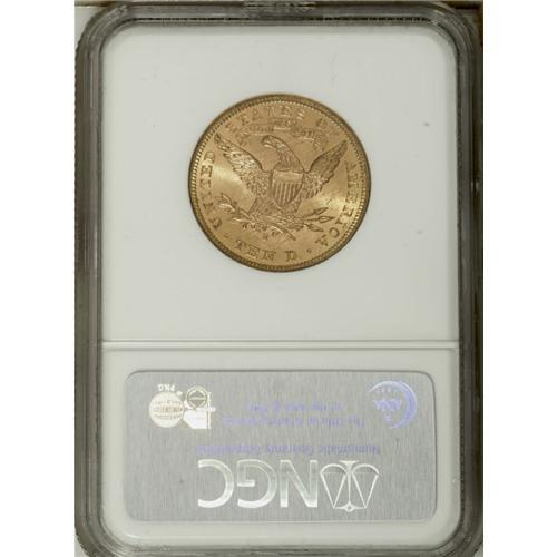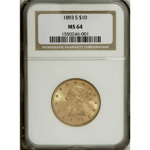 <B>1893-S $10 MS64 NGC.</B></I> Jeff Garrett and Ron Guth point out that this issue is considerably rarer than the 1893-S Morgan dollar, even though demand is not so high. This example offers outstanding eye appeal--a factor of the exuberant luster, delectable green-gold and apricot coloration, and the few singular abrasions noted under a loupe. Further attesting to the rarity are the low population figures: The present coin is the lone MS64 at NGC, with one finer, while PCGS has also certified a single near-Gem, with three coins finer (12/06).<BR><BR><b>Shipping:</b> Coin/Currency (<a target="_blank" href="http://www.heritageauctions.com/common/shipping.php">view shipping information</a>)