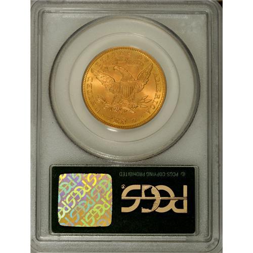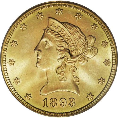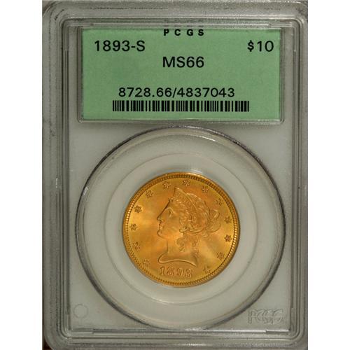 <B>1893-S $10 MS66 PCGS.</B></I> Looking over Heritage auction records one is immediately taken back by the fact that no other 1893-S eagle has been sold above the MS63 grade level, an astounding three points less than the Premium Gem offered here. Further investigation into gold references and census data proves this inexplicable void to be no accident, only a handful of Choice or better examples are known to exist despite a total Mint State population in the hundreds. One glimpse at this meticulously preserved, satiny example is all it takes to recognize the coin's special qualities. The strike is razor sharp, surface marks are virtually non-existent, and both sides are accented in lovely blue and orange pastel shades. Population: 1 in 66, 1 finer (11/06).<BR><BR><b>Shipping:</b> Coin/Currency (<a target="_blank" href="http://www.heritageauctions.com/common/shipping.php">view shipping information</a>)