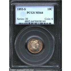 1893-S 10C MS64 PCGS. This is a satiny near-Gem whose centers are framed by russet-orange and green.