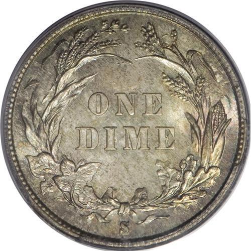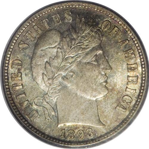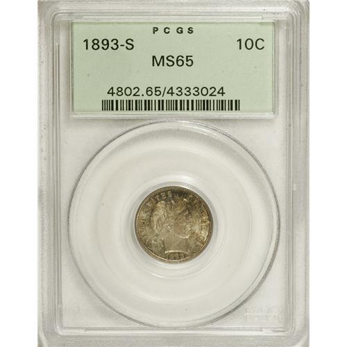 <B>1893-S 10C MS65 PCGS.</B></I> The 1892-S and 1893-S are two of the early S-mint key dates in the popular Barber dime series. While in MS65 the 1893-S edges out the 1892-S in terms of price, in finer grades the pricing equation is reversed. The present Gem offers stunning patination of pastel cherry, ice-blue, and olive on the obverse, with aqua and steel-blue on the reverse. The strike is enviably sharp, and the piece is certified in a old green-label holder. Population: 10 in 65, 4 finer (3/07).<BR><BR><b>Shipping:</b> Coins & Currency (<a target="_blank" href="http://www.heritageauctions.com/common/shipping.php">view shipping information</a>)