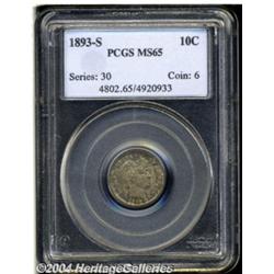<table><tr><td><TABLE cellSpacing=0 cellPadding=0 width="100%" bgColor=#000000 border=0><TBODY> <TR><TD width="100%"><TABLE cellSpacing=1 cellPadding=3 width="100%" border=0><TBODY><TR><TD width="100%" bgColor=#79735c><FONT face=arial color=#ffffff size=3><B>Description</B> </FONT></TD></TR><TR><TD width="100%" bgColor=#ffffff><FONT face=arial size=2><B>1893-S 10C MS65 PCGS.</B></I> Even though 2.4 million pieces were produced of the 1893-S, very few actually survived in high grades. This is a solid Gem example that shows mottled steel-gray toning that is accented with subtle golden-rose shades, the reverse is a bit brighter. Well defined and fully original, one tiny abrasion is seen on Liberty's cheek. Population: 5 in 65, 2 finer (10/03). </FONT></TD></TR></TBODY></TABLE></TD></TR></TBODY></TABLE><BR><A name=PricesRealized></A><TABLE cellSpacing=0 cellPadding=0 width="100%" bgColor=#000000 border=0><TBODY><TR><TD width="100%"><TABLE cellSpacing=1 cellPadding=3 width="100%" border=0><TBODY><TR><TD width="100%" bgColor=#79735c><A name=PR><FONT face=arial color=#ffffff size=3><B>Previous Prices from Heritage Auctions</B> </FONT></A></TD></TR><TR><TD bgColor=#f6f6ed><TABLE cellSpacing=0 cellPadding=0 width="100%" border=1><TBODY><TR><TD align=middle width="33%"><B>Date</B></TD><TD align=middle width="33%"><B>Service</B></TD><TD align=middle width="33%"><B>Price</B></TD></TR><TR bgColor=whitesmoke><TD width="33%"><B>01/12/2002</B></TD><TD width="33%">PCGS</TD><TD width="33%">$2,300.00</TD></TR><TR bgColor=whitesmoke><TD width="33%"><B>02/01/2001</B></TD><TD width="33%">PCGS</TD><TD width="33%">$2,012.00</TD></TR></TBODY></TABLE></TD></TR><TR><TD bgColor=#ffffff><FONT face=arial size=1 ?>PLEASE NOTE: All prices realized reflect the final hammer price PLUS the buyer's premium in auctions that charge a buyer's premium. Each item has a notation at the top of the listing indicating whether that lot included a buyer's premium. Example: A item that sells with a final hammer price of $100 and a 20% buyer's premium will display with a price realized of $120. All information listed is intended to be as accurate as possible, but errors are possible. Please use this guide carefully and inform us of any inaccuracies. </FONT></TD></TR></TBODY></TABLE></TD></TR></TBODY></TABLE><BR><TABLE cellSpacing=0 cellPadding=0 width="100%" bgColor=#000000 border=0><TBODY><TR><TD width="100%"><TABLE cellSpacing=1 cellPadding=3 width="100%" border=0><TBODY><TR><TD width="100%" bgColor=#79735c colSpan=6><FONT face=arial color=#ffffff size=3><B>Price Guide*</B> </FONT></TD></TR><TR bgColor=#f6f6ed><TD align=middle><B>Grade</B> </TD><TD align=middle><B>Coin World<BR>(Trends)</B> </TD><TD align=middle><B>Numismedia<BR>Retail</B> </TD><TD align=middle><B>Numismedia<BR>Wholesale</B> </TD><TD align=middle><B>Coin<BR>Universe</B> </TD><TD align=middle><B>Heritage<BR>Value Index</B> </TD></TR><TR bgColor=#ffffff><TD align=middle>64</TD><TD align=right>$1,500.00</TD><TD align=right>---</TD><TD align=right>$1,325.00</TD><TD align=right>$1,750.00</TD><TD align=right>$1,174.38</TD></TR><TR style="FONT-WEIGHT: bold" bgColor=#cccfdd><TD align=middle>65</TD><TD align=right>$3,875.00</TD><TD align=right>---</TD><TD align=right>$2,625.00</TD><TD align=right>$4,500.00</TD><TD align=right>$2,818.13</TD></TR><TR bgColor=#ffffff><TD align=middle>66</TD><TD align=right>---</TD><TD align=right>---</TD><TD align=right>$3,680.00</TD><TD align=right>$6,750.00</TD><TD align=right>$4,725.00</TD></TR><TR bgColor=#ffffff><TD colSpan=6><FONT size=1>*All information listed is intended to be as accurate as possible, but errors are possible. No item may be returned or refused based on this information which is provided as a service to our customers. You should contact each pricing source directly to determine the accuracy of this information. </FONT></TD></TR></TBODY></TABLE></TD></TR></TBODY></TABLE><BR><TABLE cellSpacing=0 cellPadding=0 width="100%" bgColor=#000000 border=0><TBODY><TR><TD width="100%"><TABLE cellSpacing=1 cellPadding=3 width="100%" border=0><TBODY><TR><TD width="100%" bgColor=#79735c><FONT face=arial color=#ffffff size=3><B>Population Guide</B> </FONT></TD></TR><TR bgColor=#ffffff><TD align=middle><!-- Begin Output of Population Grid--><TABLE cellSpacing=0 cellPadding=0 width="100%" border=0><TBODY><TR><TD vAlign=center><TABLE cellSpacing=0 width="100%" border=1 cellsadding="3"><TBODY><TR><TD vAlign=center><TABLE cellSpacing=0 cellPadding=3 width="100%" border=1><TBODY><TR><TD vAlign=center align=middle bgColor=#f0f1e8 colSpan=2 <CENTER><FONT face=Arial size=2><B>PCGS Pop </B></FONT><CENTER></CENTER></TD><TD vAlign=center align=middle bgColor=#f0f1e8 colSpan=2><CENTER><FONT face=Arial size=2><B>NGC Pop</B></CENTER></FONT></TD></TR><TR><TD vAlign=center><FONT face=Arial size=2>(65)</FONT> </TD><TD vAlign=center align=right><FONT face=Arial size=2>5</FONT> </TD><TD vAlign=center><FONT face=Arial size=2>(65)</FONT> </TD><TD vAlign=center align=right><FONT face=Arial size=2>8</FONT> </TD></TR><TR><TD vAlign=center><FONT face=Arial size=2>(>65)</FONT> </TD><TD vAlign=center align=right><FONT face=Arial size=2>2</FONT> </TD><TD vAlign=center><FONT face=Arial size=2>(>65)</FONT> </TD><TD vAlign=center align=right><FONT face=Arial size=2>1</FONT> </TD></TR></TBODY></TABLE></TD></TR></TBODY></TABLE></TD></TR></TBODY></TABLE><!-- End Output of Population Grid--></TD></TR></TBODY></TABLE></TD></TR></TBODY></TABLE><BR><TABLE cellSpacing=0 cellPadding=0 width="100%" bgColor=#000000 border=0><TBODY><TR> <font color='#000000'><span style='background-color: #FFFFFF'><td bgcolor='#FFFFFE'> Important notice: Heritage usually auctions material at the rate of 200-250 lots per hour. On some occasions eBay Live bid software or the Internet may not be able to keep up with the pace of the auction. We recommend placing a realistic absentee bid now as insurance to avoid disappointment. Occasionally the auctioneer may eliminate or reject an eBay Live bid, and t