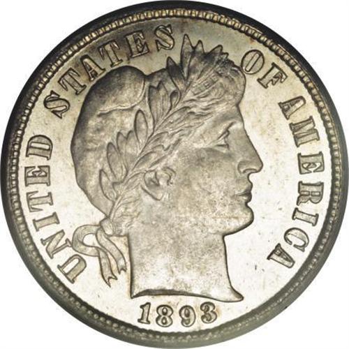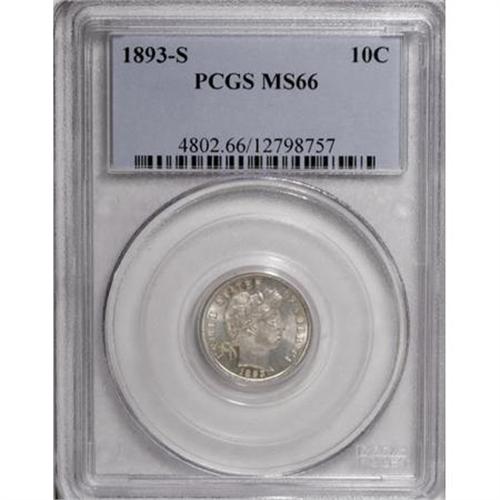 <B>1893-S 10C MS66 PCGS.</B></I> One of the early S-mint Barber dime issues, the 1893-S is surprisingly elusive in Gem condition, and almost never seen finer than the present Premium Gem. In fact, only one coin of the issue is certified finer at both services combined (3/08). This piece boasts radiant silver-white surfaces tinged with gold, splendid eye appeal, and considerable field-device contrast.<BR><BR><B>Coin Engraver:</B> Charles E. Barber<BR><BR><b>Shipping:</b> Coins & Currency (<a target="_blank" href="http://www.heritageauctions.com/common/shipping.php">view shipping information</a>)