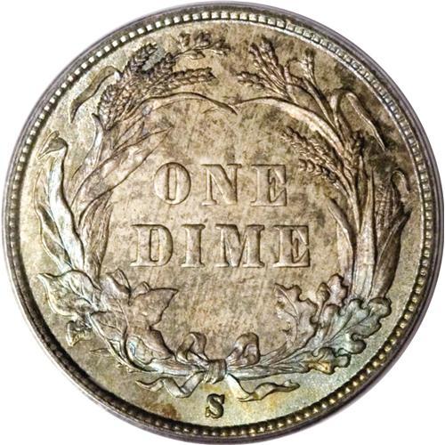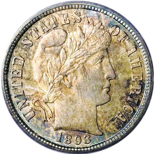 <B>1893-S 10C MS67 PCGS.</B></I> The 1892-S and 1893-S are perennial favorites on the want lists of Barber dime collectors--while the 1894-S is, of course, another matter entirely. This incredibly lovely Superb Gem example of the 1893-S stands alone at the top of both the PCGS and NGC population reports (3/07), the only MS67 certified at either service. This specimen tops the 1893-S dime in our January 2005 Signature Auction of the phenomenal John C. Hugon Collection of Barber coinage (Auction 360, lot 4006) by a full three grade points! The obverse offers a delectable melange of pastel pink-gray with tinges of ice-blue at the rims, while the reverse offers a more verdant palette of forest-green, gold, and aqua. Both sides are expectedly free of mentionable distractions, and the bold strike completes the superlative package. Population: 1 in 67, 0 finer (2/07).<BR><I>From The Palakika Collection.</B></I><BR><BR><b>Shipping:</b> Coins & Currency (<a target="_blank" href="http://www.heritageauctions.com/common/shipping.php">view shipping information</a>)