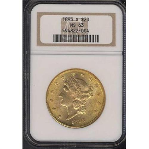 <b>1893-S $20 Liberty. NGC graded MS63.</b> NGC Pop: 235/17. With choice orange-gold patina on the devices and swirling around in the frosty fields. Struck with technical exactness throughout <b>(PCGS # 9024)</b> <i>