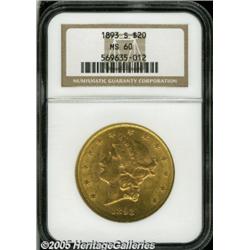 <B>1893-S $20 MS60 NGC.</B></I> Boldly struck with rich luster and visually pleasing pink and green-gold toning. A relatively small number of mainly trivial surface blemishes are observed, mostly on the obverse. This piece may be conservatively graded, by one or two points.