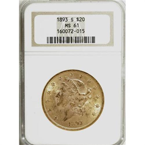 <B>1893-S $20 MS61 NGC.</B></I> NGC Census: (1610/1609). PCGS Population (733/1579). Mintage: 996,175. Numismedia Wsl. Price for NGC/PCGS coin in MS61: $890. (#9024)<BR><BR><B>Coin Engraver:</B> James B. Longacre<BR><BR><b>Shipping:</b> Coins & Currency (<a target="_blank" href="http://www.heritageauctions.com/common/shipping.php">view shipping information</a>)