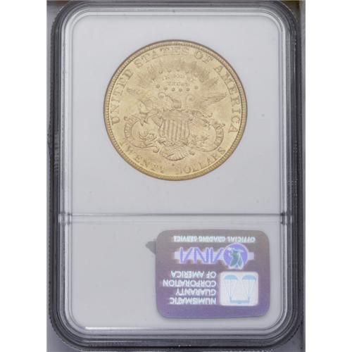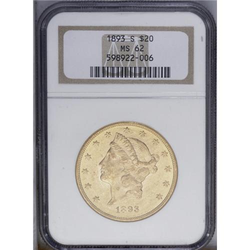<B>1893-S<$20> MS62 NGC.</B></I> A boldly defined S-mint Liberty twenty with unbroken mint luster. Typically abraded on the chin and obverse field, but the reverse is unmarked for the grade. <BR><BR><B>Important notice:</B> Heritage usually auctions material at the rate of 200-250 lots per hour. On some occasions eBay Live bid software or the Internet may not be able to keep up with the pace of the auction. We recommend placing a realistic absentee bid now as insurance to avoid disappointment. Occasionally the auctioneer may eliminate or reject an eBay Live bid, and the auctioneer may also reopen a lot after the close of the eBay live bidding (usually because we missed an audience bid), and may reject your bid even if it shows you as the winning bidder. By bidding via eBay Live, you agree that Heritage may award the lot to another bidder at its sole discretion under the circumstances described above or any other reasonable circumstances. Since eBay bids are not shown to us until we open the lot on the floor, we treat those bids just like floor bids. In most cases the floor responds before the eBay bid is presented to us, due to Internet lag time, so for consistency we have made it a policy that floor bids are always considered first over tie eBay live bids. Also please note that all Heritage lots purchased through eBay Live carry a 20% Buyer's Premium. Please make sure you read the Terms and Conditions before you bid. This lot is being auctioned in conjunction with a live floor auction by Heritage Galleries & Auctioneers. All final auction and invoice information will be supplied by Heritage Galleries & Auctioneers, and all other information should be considered preliminary. Lot:4344 <BR><BR><B>Winning Notification and Billing:</B> After the FINAL session in this auction is complete, Heritage will send e-mail and snail mail invoices. This process normally takes several days. All final auction and invoice information will be supplied by Heritage Galleries & Auctioneers, and all other information should be considered preliminary. <BR><BR>This auction will be conducted on a live auction floor and over the Internet through eBay Live. If you choose to place an absentee bid, please take a moment to <font color='#0000ff'><u><a href='http://pages.ebay.com/liveauctions/help/before/laabsentee.html'>learn how eBay Live absentee bidding works</a></u></font><font color='#000000'>