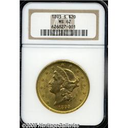 <B>1893-S $20 MS62 NGC.</B></I> An apricot-gold example with good luster and a bold strike. A nick on the obverse rim at 5 o'clock and a couple of moderate marks on the face deny a higher grade.