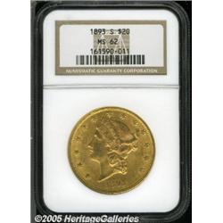 <B>1893-S $20 MS62 NGC.</B></I> Bright apricot-gold surfaces display well struck devices. Light contact marks are apparent on the obverse.