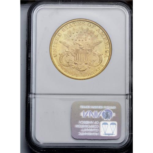 <B>1893-S<$20> MS62 NGC.</B></I> The luster is booming, and the fields and devices are cleaner than customary for the MS62 grade. Good value is provided for the selective buyer.