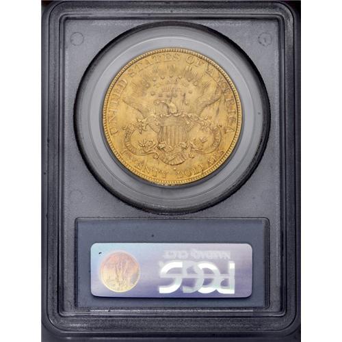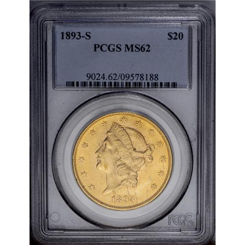 <B>1893-S<$20> MS62 PCGS.</B></I> Bright surfaces yield peach-gold coloration overlain with streaks of light tan. Light contact marks are visible on Liberty's cheek, in the left obverse field, and along the left obverse rim. <BR><BR><B>Important notice:</B> Heritage usually auctions material at the rate of 200-250 lots per hour. On some occasions eBay Live bid software or the Internet may not be able to keep up with the pace of the auction. We recommend placing a realistic absentee bid now as insurance to avoid disappointment. Occasionally the auctioneer may eliminate or reject an eBay Live bid, and the auctioneer may also reopen a lot after the close of the eBay live bidding (usually because we missed an audience bid), and may reject your bid even if it shows you as the winning bidder. By bidding via eBay Live, you agree that Heritage may award the lot to another bidder at its sole discretion under the circumstances described above or any other reasonable circumstances. Since eBay bids are not shown to us until we open the lot on the floor, we treat those bids just like floor bids. In most cases the floor responds before the eBay bid is presented to us, due to Internet lag time, so for consistency we have made it a policy that floor bids are always considered first over tie eBay live bids. Also please note that all Heritage lots purchased through eBay Live carry a 20% Buyer's Premium. Please make sure you read the Terms and Conditions before you bid. This lot is being auctioned in conjunction with a live floor auction by Heritage Galleries & Auctioneers. All final auction and invoice information will be supplied by Heritage Galleries & Auctioneers, and all other information should be considered preliminary. Lot:4347 <BR><BR><B>Winning Notification and Billing:</B> After the FINAL session in this auction is complete, Heritage will send e-mail and snail mail invoices. This process normally takes several days. All final auction and invoice information will be supplied by Heritage Galleries & Auctioneers, and all other information should be considered preliminary. <BR><BR>This auction will be conducted on a live auction floor and over the Internet through eBay Live. If you choose to place an absentee bid, please take a moment to <font color='#0000ff'><u><a href='http://pages.ebay.com/liveauctions/help/before/laabsentee.html'>learn how eBay Live absentee bidding works</a></u></font><font color='#000000'>