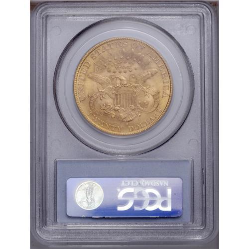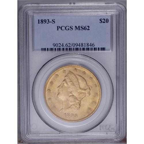 <B>1893-S<$20> MS62 PCGS.</B></I> Modest brightness is seen in the fields of this yellow-gold, BU quality example. Typically abraded for the grade with razor sharp striking detail. <BR><BR><B>Important notice:</B> Heritage usually auctions material at the rate of 200-250 lots per hour. On some occasions eBay Live bid software or the Internet may not be able to keep up with the pace of the auction. We recommend placing a realistic absentee bid now as insurance to avoid disappointment. Occasionally the auctioneer may eliminate or reject an eBay Live bid, and the auctioneer may also reopen a lot after the close of the eBay live bidding (usually because we missed an audience bid), and may reject your bid even if it shows you as the winning bidder. By bidding via eBay Live, you agree that Heritage may award the lot to another bidder at its sole discretion under the circumstances described above or any other reasonable circumstances. Since eBay bids are not shown to us until we open the lot on the floor, we treat those bids just like floor bids. In most cases the floor responds before the eBay bid is presented to us, due to Internet lag time, so for consistency we have made it a policy that floor bids are always considered first over tie eBay live bids. Also please note that all Heritage lots purchased through eBay Live carry a 20% Buyer's Premium. Please make sure you read the Terms and Conditions before you bid. This lot is being auctioned in conjunction with a live floor auction by Heritage Galleries & Auctioneers. All final auction and invoice information will be supplied by Heritage Galleries & Auctioneers, and all other information should be considered preliminary. Lot:4343 <BR><BR><B>Winning Notification and Billing:</B> After the FINAL session in this auction is complete, Heritage will send e-mail and snail mail invoices. This process normally takes several days. All final auction and invoice information will be supplied by Heritage Galleries & Auctioneers, and all other information should be considered preliminary. <BR><BR>This auction will be conducted on a live auction floor and over the Internet through eBay Live. If you choose to place an absentee bid, please take a moment to <font color='#0000ff'><u><a href='http://pages.ebay.com/liveauctions/help/before/laabsentee.html'>learn how eBay Live absentee bidding works</a></u></font><font color='#000000'>
