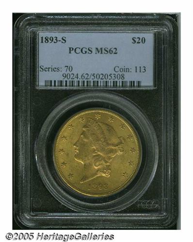 <B>1893-S<$20> MS62 PCGS.</B></I> Sharply struck devices, with pink and yellow-gold surfaces. A few light marks are scattered over each side.