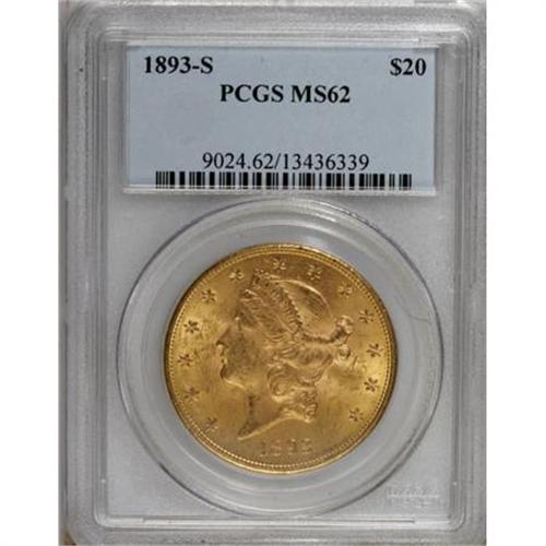 <B>1893-S $20 MS62 PCGS.</B></I> PCGS Population (1076/436). NGC Census: (1340/258). Mintage: 996,175. Numismedia Wsl. Price for NGC/PCGS coin in MS62: $765. (#9024)<BR><BR><B>Coin Engraver:</B> James B. Longacre<BR><BR><b>Shipping:</b> Coins & Currency (<a target="_blank" href="http://www.heritageauctions.com/common/shipping.php">view shipping information</a>)