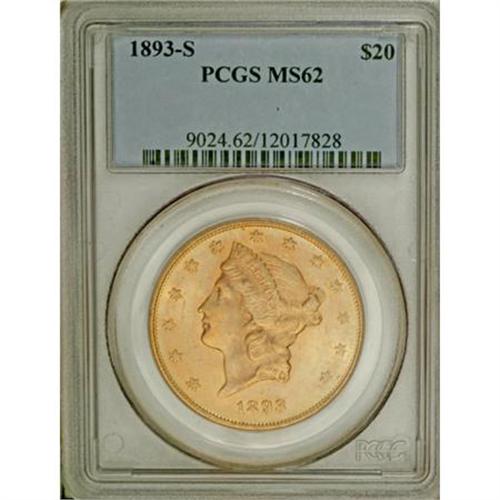 <B>1893-S $20 MS62 PCGS.</B></I> A shining and solidly struck piece that shows subtle mint-green accents that stand out against predominantly orange-gold fields. Light to moderate abrasions are present on each side, and the surfaces show slight haze.<BR><I>From The York/Hallenbeck #2 Current Finest PCGS Registry Set of Liberty Double Eagles.</B></I><BR><BR><B>Coin Engraver:</B> James B. Longacre<BR><BR><b>Shipping:</b> Coins & Currency (<a target="_blank" href="http://www.heritageauctions.com/common/shipping.php">view shipping information</a>)