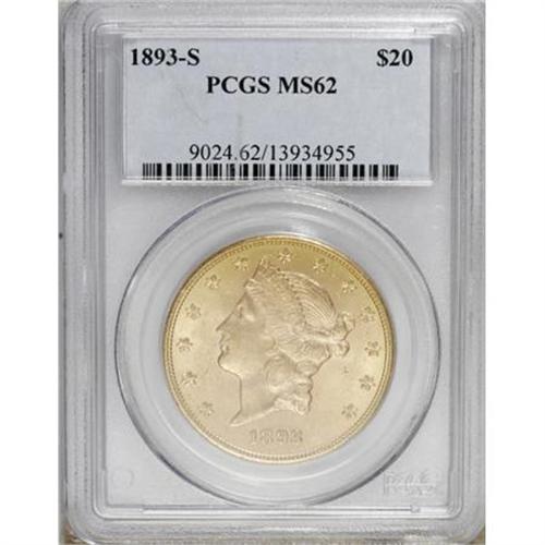 <B>1893-S $20 MS62 PCGS.</B></I> PCGS Population (1124/446). NGC Census: (1344/258). Mintage: 996,175. Numismedia Wsl. Price for NGC/PCGS coin in MS62: $925. (#9024)<BR><BR><B>Coin Engraver:</B> James B. Longacre<BR><BR><b>Shipping:</b> Coins & Currency (<a target="_blank" href="http://www.heritageauctions.com/common/shipping.php">view shipping information</a>)