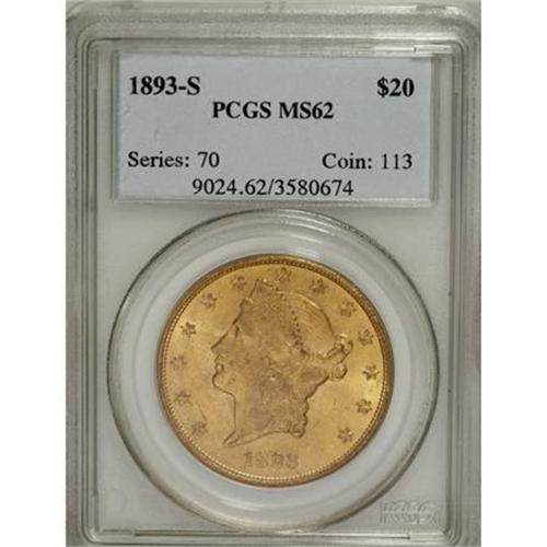 <B>1893-S $20 MS62 PCGS.</B></I> Rich orange-gold patina resides on the lustrous surfaces of this sharply struck S-mint representative. We note a few minute contact marks.<BR><BR><B>Coin Engraver:</B> James B. Longacre<BR><BR><b>Shipping:</b> Coins & Currency (<a target="_blank" href="http://www.heritageauctions.com/common/shipping.php">view shipping information</a>)