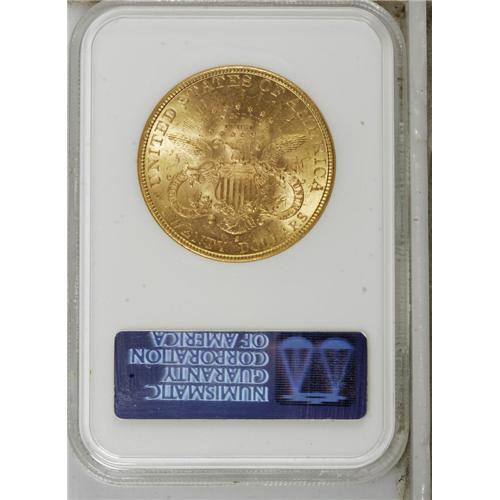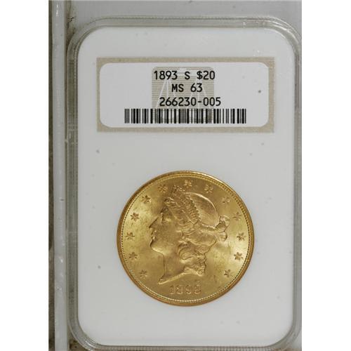 <B>1893-S $20 MS63 NGC.</B></I> A lustrous and nicely struck lime-gold representative that has a few wispy grazes, but lacks individually mentionable marks. Certified in a former generation holder.<BR><BR><b>Shipping:</b> Coins & Currency (<a target="_blank" href="http://www.heritageauctions.com/common/shipping.php">view shipping information</a>)