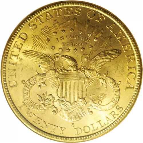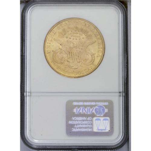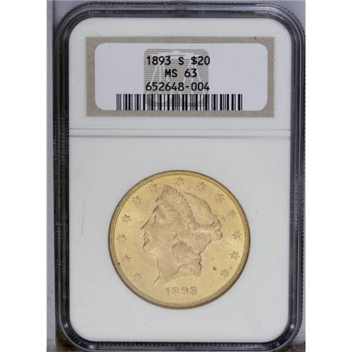 <B>1893-S<$20> MS63 NGC.</B></I> Pretty green-gold color with a modicum of light abrasions, consistent with the grade. The strike is a bit soft on some of the star radials, as well as on the eagle's wing feathers. The luster is brilliant, with a small dark toning spot behind Liberty's head. An appealing coin overall, exceedingly difficult to find any finer. NGC has graded 17 higher (3/06). <BR><BR><B>Important notice:</B> Heritage usually auctions material at the rate of 200-250 lots per hour. On some occasions eBay Live bid software or the Internet may not be able to keep up with the pace of the auction. We recommend placing a realistic absentee bid now as insurance to avoid disappointment. Occasionally the auctioneer may eliminate or reject an eBay Live bid, and the auctioneer may also reopen a lot after the close of the eBay live bidding (usually because we missed an audience bid), and may reject your bid even if it shows you as the winning bidder. By bidding via eBay Live, you agree that Heritage may award the lot to another bidder at its sole discretion under the circumstances described above or any other reasonable circumstances. Since eBay bids are not shown to us until we open the lot on the floor, we treat those bids just like floor bids. In most cases the floor responds before the eBay bid is presented to us, due to Internet lag time, so for consistency we have made it a policy that floor bids are always considered first over tie eBay live bids. Also please note that all Heritage lots purchased through eBay Live carry a 20% Buyer's Premium. Please make sure you read the Terms and Conditions before you bid. This lot is being auctioned in conjunction with a live floor auction by Heritage Galleries & Auctioneers. All final auction and invoice information will be supplied by Heritage Galleries & Auctioneers, and all other information should be considered preliminary. Lot:4348 <BR><BR><B>Winning Notification and Billing:</B> After the FINAL session in this auction is complete, Heritage will send e-mail and snail mail invoices. This process normally takes several days. All final auction and invoice information will be supplied by Heritage Galleries & Auctioneers, and all other information should be considered preliminary. <BR><BR>This auction will be conducted on a live auction floor and over the Internet through eBay Live. If you choose to place an absentee bid, please take a moment to <font color='#0000ff'><u><a href='http://pages.ebay.com/liveauctions/help/before/laabsentee.html'>learn how eBay Live absentee bidding works</a></u></font><font color='#000000'>