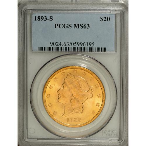<B>1893-S $20 MS63 PCGS.</B></I> Apricot-gold with a touch of wheat on the obverse and a zone of butter-yellow at the lower reverse. Liberty's features are well-defined, and the light abrasions visible on each side offer few distractions. Though this issue's mintage of nearly a million pieces dwarfs that of the Philadelphia and Carson City issues for this date, the former sells at a significant discount compared to examples like this one.<BR><BR><b>Shipping:</b> Coin/Currency (<a target="_blank" href="http://www.heritageauctions.com/common/shipping.php">view shipping information</a>)