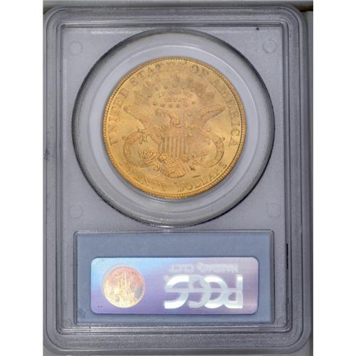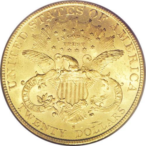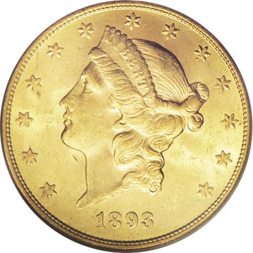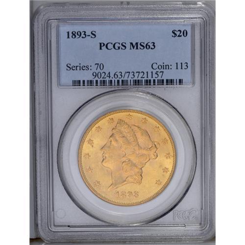 <B>1893-S<$20> MS63 PCGS.</B></I> This lustrous and moderately abraded example features luminous olive and sun-gold tints. The strike is typical near the top of the coronet and on the left side obverse stars, but most areas of the devices are bold. This problem-free piece has above average eye appeal, and is a worthy contribution to a specialized collection.