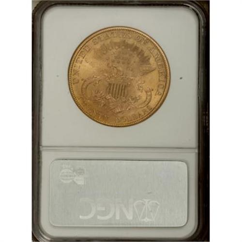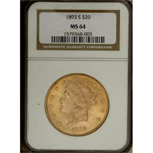 <B>1893-S $20 MS64 NGC.</B></I> Despite a mintage that approaches the million coin mark, few survivors of this issue demonstrate such remarkable eye appeal and overall quality. In fact, while NGC has recorded 19 examples in MS64 it has yet to grade an example in Gem or finer. This example is highly lustrous with brilliant pink-gold color. The surfaces are satiny and show no unsightly marks. All of the design elements on both sides are extremely sharp. Perhaps a few to many minor marks on Liberty's cheek prevent a Gem grade. Census: 19 in 64, 0 finer (11/07).<BR><BR><B>Coin Engraver:</B> James B. Longacre<BR><BR><b>Shipping:</b> Coins & Currency (<a target="_blank" href="http://www.heritageauctions.com/common/shipping.php">view shipping information</a>)