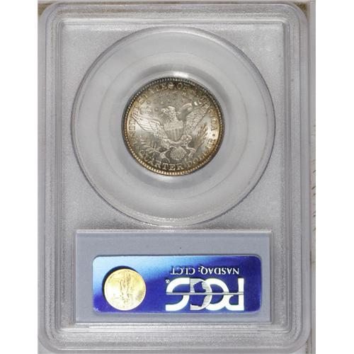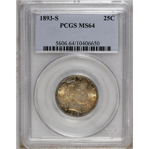 <B>1893-S 25C MS64 PCGS.</B></I> Choice and solidly struck with appealing luster beneath vivid lemon-yellow, reddish-orange, and violet patina. A couple of isolated marks appear on Liberty's face. Population: 14 in 64, 10 finer (10/06).<BR><BR><b>Shipping:</b> Coin/Currency (<a target="_blank" href="http://www.heritageauctions.com/common/shipping.php">view shipping information</a>)