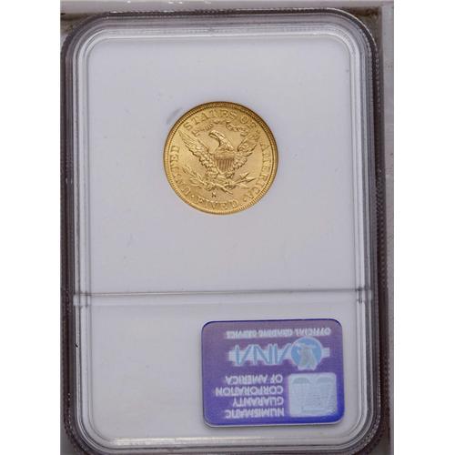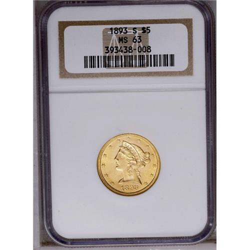 <B>1893-S<$5> MS63 NGC.</B></I> A well struck example that shows some surface roughness on the portrait, apparently due to die rust, and a few scattered, light abrasions. Despite these minor drawbacks, this example appears quite high-end for the assigned grade. NGC has graded 31 examples finer (3/06). <BR><BR><B>Important notice:</B> Heritage usually auctions material at the rate of 200-250 lots per hour. On some occasions eBay Live bid software or the Internet may not be able to keep up with the pace of the auction. We recommend placing a realistic absentee bid now as insurance to avoid disappointment. Occasionally the auctioneer may eliminate or reject an eBay Live bid, and the auctioneer may also reopen a lot after the close of the eBay live bidding (usually because we missed an audience bid), and may reject your bid even if it shows you as the winning bidder. By bidding via eBay Live, you agree that Heritage may award the lot to another bidder at its sole discretion under the circumstances described above or any other reasonable circumstances. Since eBay bids are not shown to us until we open the lot on the floor, we treat those bids just like floor bids. In most cases the floor responds before the eBay bid is presented to us, due to Internet lag time, so for consistency we have made it a policy that floor bids are always considered first over tie eBay live bids. Also please note that all Heritage lots purchased through eBay Live carry a 20% Buyer's Premium. Please make sure you read the Terms and Conditions before you bid. This lot is being auctioned in conjunction with a live floor auction by Heritage Galleries & Auctioneers. All final auction and invoice information will be supplied by Heritage Galleries & Auctioneers, and all other information should be considered preliminary. Lot:2834 <BR><BR><B>Winning Notification and Billing:</B> After the FINAL session in this auction is complete, Heritage will send e-mail and snail mail invoices. This process normally takes several days. All final auction and invoice information will be supplied by Heritage Galleries & Auctioneers, and all other information should be considered preliminary. <BR><BR>This auction will be conducted on a live auction floor and over the Internet through eBay Live. If you choose to place an absentee bid, please take a moment to <font color='#0000ff'><u><a href='http://pages.ebay.com/liveauctions/help/before/laabsentee.html'>learn how eBay Live absentee bidding works</a></u></font><font color='#000000'>