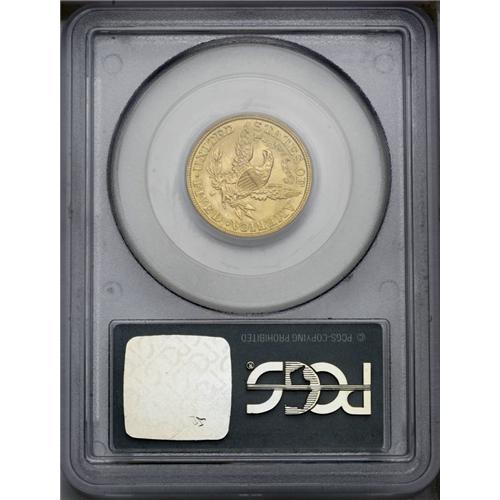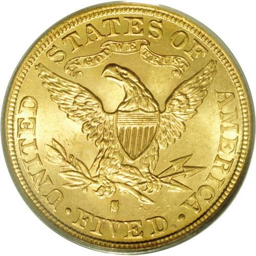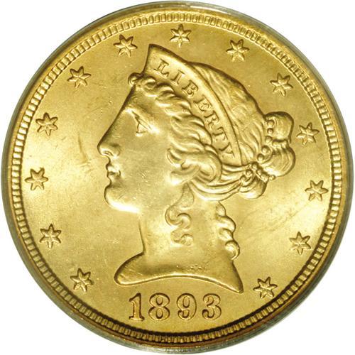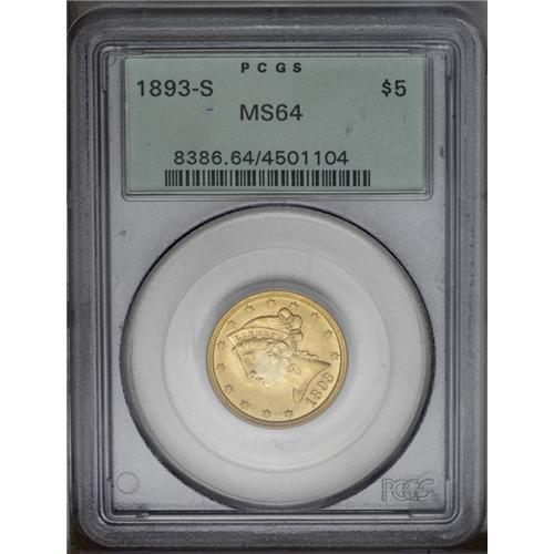 <B>1893-S $5 MS64 PCGS.</B></I> Although not particularly rare in bagmarked lower Mint State grades, the 1893-S emerges as a conditional rarity at the MS64 level. This attractive older holder near-Gem is lustrous and displays rich apricot color, with a hint of greenish-gold hue on the cheek. The strike is good, and the field and portrait are only minimally marked. Population: 19 in 64, 2 finer (12/05).