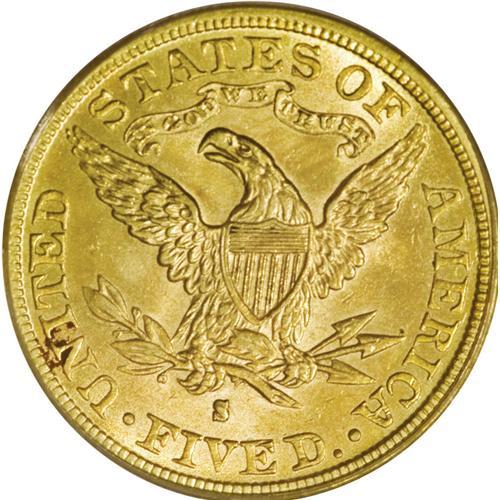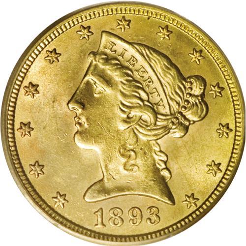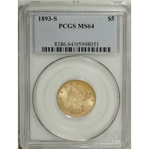 1893-S $5 MS64 PCGS. Boldly struck with shimmering, sa