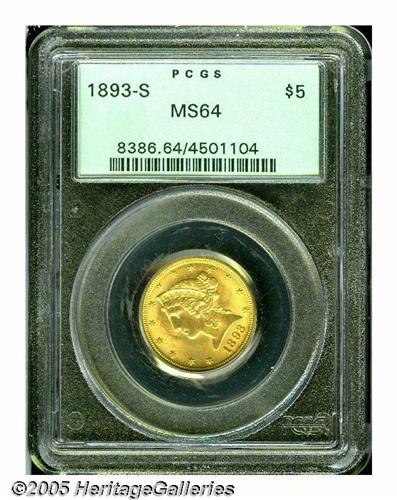 <B>1893-S<$5> MS64 PCGS.</B></I> This is a date with a modest mintage, but that becomes conditionally rare in Choice and above Mint State grades. There is softness to the detail of the hair, but this is a good looking specimen, with warm surface glow from satiny fields, and that is only mildly abraded. Rich golden color deepens slightly at the borders. Population: 18 in 64, 2 finer (3/05).
