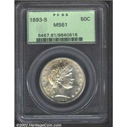 1893-S 50C MS61 PCGS. This is a mostly untoned, silver-gray example with a lone swirl of reddish col