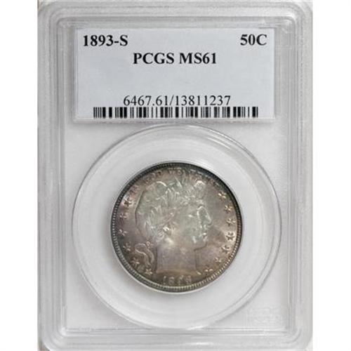 <B>1893-S 50C MS61 PCGS.</B></I> This second-year San Francisco Barber half issue was not saved in quantity, and any Mint State survivor is a scarce and desirable coin. This piece has vibrant luster and clean fields that show whispers of gold-orange and sage patina. A series of reeding marks on the cheek accounts for the grade. Population: 3 in 61, 39 finer (3/08).<BR><BR><B>Coin Engraver:</B> Charles E. Barber<BR><BR><b>Shipping:</b> Coins & Currency (<a target="_blank" href="http://www.heritageauctions.com/common/shipping.php">view shipping information</a>)