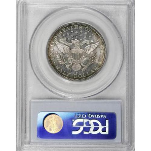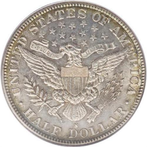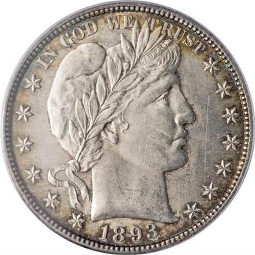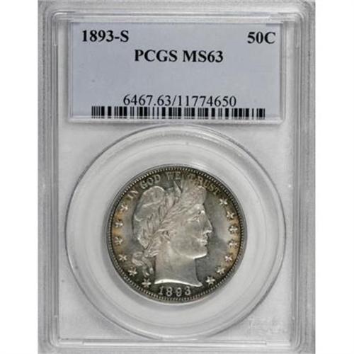 <B>1893-S 50C MS63 PCGS.</B></I> This well-struck piece shows pretty amber-gold and steel-blue coloration near the peripheries on each side, with moderate luster visible in the silvery centers. There are a few slide marks on Liberty's cheek, but this coin is nice for the grade. A desirable series key, produced to the extent of only 740,000 coins. Population: 18 in 63, 17 finer (8/07).<BR><BR><B>Coin Engraver:</B> Charles E. Barber<BR><BR><b>Shipping:</b> Coins & Currency (<a target="_blank" href="http://www.heritageauctions.com/common/shipping.php">view shipping information</a>)