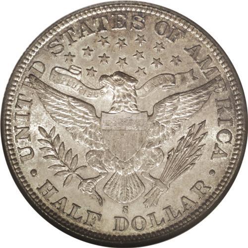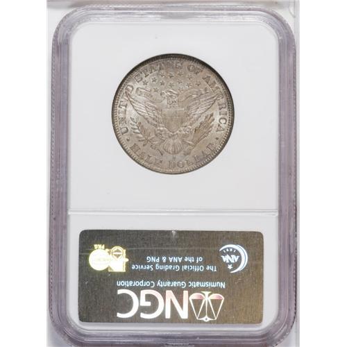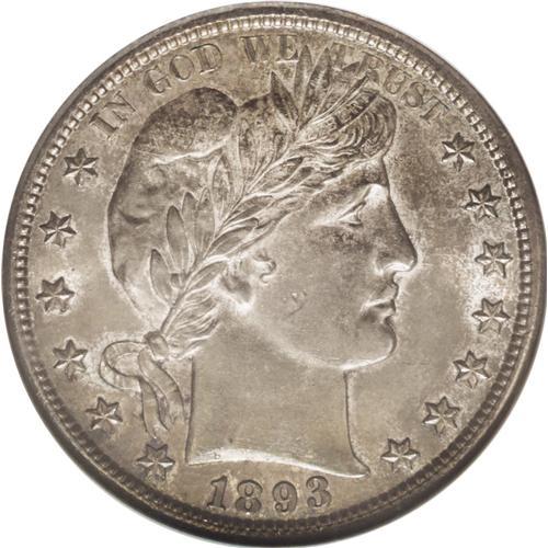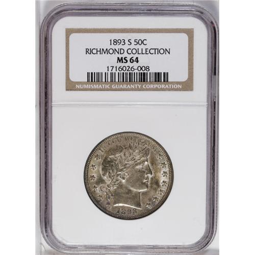 <B>1893-S<50C> MS64 NGC.</B></I> Ex: Richmond Collection. The 1893-S is a series key, as any Barber half dollar aficionado knows, due to its skimpy mintage of 740,000 pieces. In point of fact, the 1893-S half in Mint State is very nearly as rare as the 1893-S Morgan dollar: While both services together have certified 58 '93-S Morgans in Mint State, they have certified only 79 Mint State Barber halves of this date. This example offers light olive-green patina on each side, with glints of copper-gold at the rims. A couple of small reeding marks are noted on Liberty's cheek, and the strike is bold save for the eagle's right (facing) claw and the shield corner and upper wingtip, as often seen. A pleasing example of this rare issue, exceeded by only seven pieces at NGC and PCGS combined. Census: 8 in 64, 2 finer (7/06).
