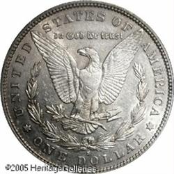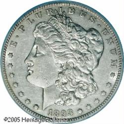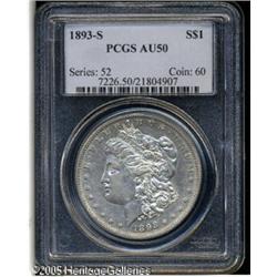 <B>1893-S<img border='0' src='http://www.heritagecoins.com/images/star.gif' width=10 height=10>$1 AU50 PCGS.</B></I> There seems to be an ever increasing number of Morgan Dollar specialists in today's hobby, a trend that places more and more date collector pressure on the 1893-S. With just 100,000 pieces produced and precious few Mint State survivors certified at NGC and PCGS, the '93-S is in great demand in all circulated grades, particularly those that attain the AU level. Light rub is evenly distributed over both sides of this mostly untoned example. There are, however, flickers of golden iridescence in a few of the more protected areas toward the border areas. The surfaces are scuffy from circulation, but ample remnants of a semi-prooflike finish are readily evident. A contact mark on Liberty's lower cheek near her neck is noted for accuracy.<BR><I>From The Banks Collection.</B></I> Lot:10433